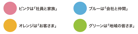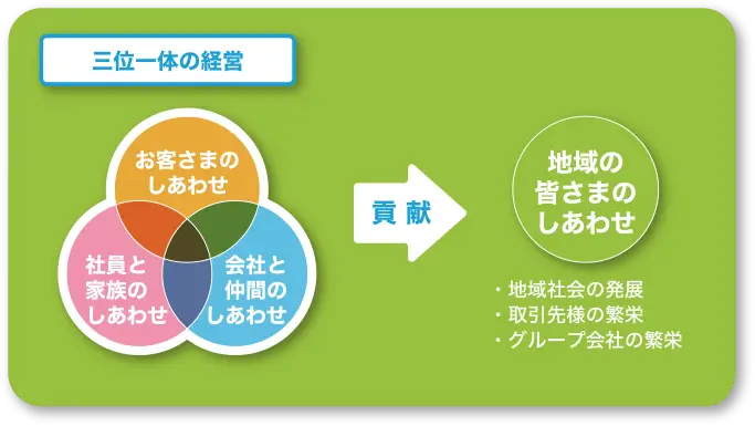 「社員と家族」「会社と仲間」「お客さま」「地域」の皆さまの「4つのしあわせ」に貢献してまいります。