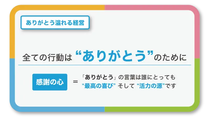 「社員と家族」「会社と仲間」「お客さま」「地域」の皆さまに「ありがとう」の言葉だけでなく、感謝の気持ちを常に持ち続けてまいります。